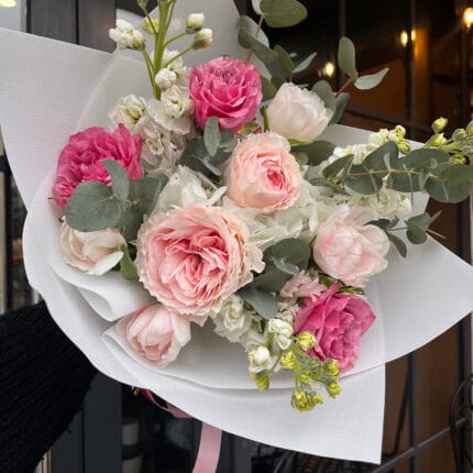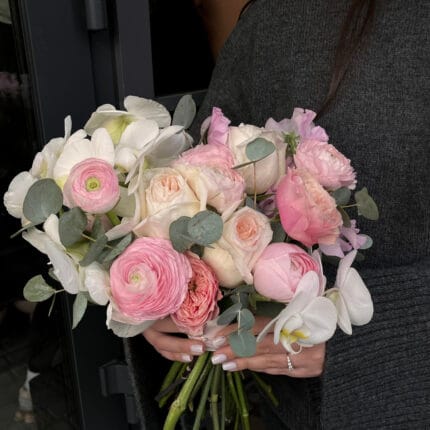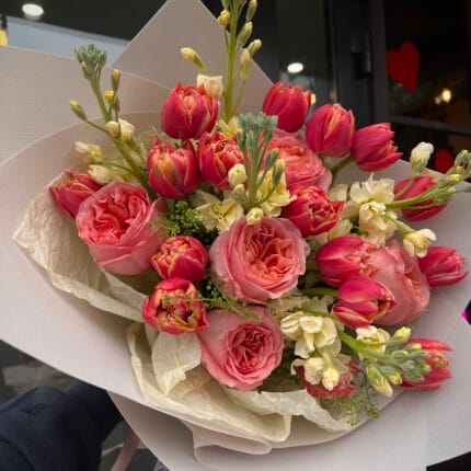Наші флористи створюють букети з найкращих квітів: троянди, півонії, хризантеми, тюльпани, лілії, орхідеї та інші сезонні варіанти. Також ви можете доповнити замовлення подарунками, які маєм в асортименті – листівки, вази, іграшки.