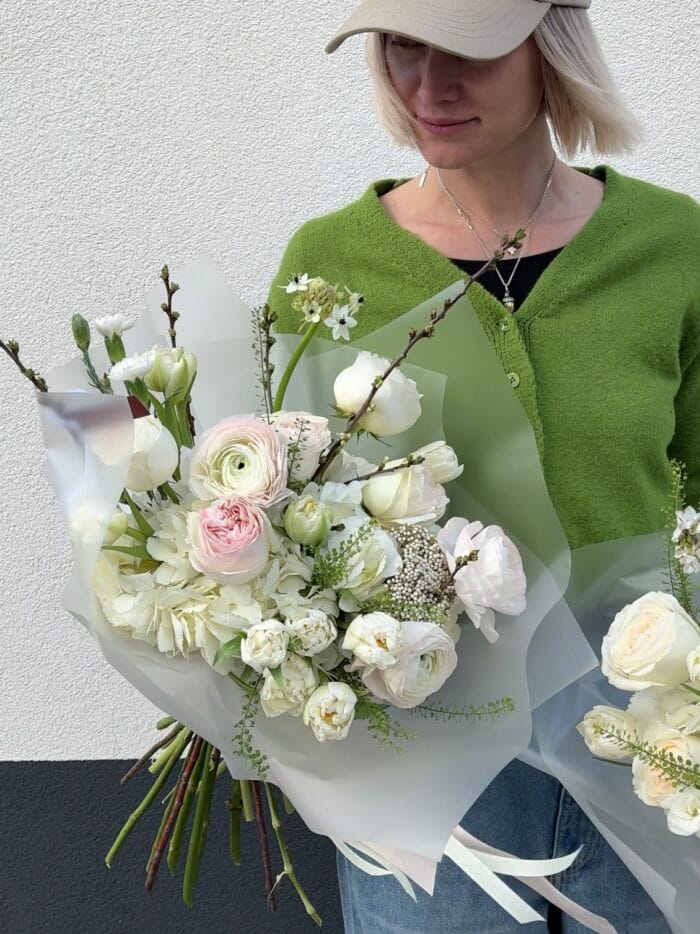 Амеліна — букет із відчуттям чистоти та природної гармонії. Світлі відтінки в поєднанні зі свіжою зеленню створюють легку й витончену композицію, яка виглядає дуже елегантно. У ньому є спокійна краса, що не потребує гучних акцентів — лише м’яка атмосфера та природна ніжність. Такий букет чудово підходить для щирих слів, теплих привітань або моментів, коли хочеться подарувати комусь відчуття світла й спокою. Замовляйте Амеліну в BRUSNYTSIA — подаруйте ніжність, яка запам’ятається.
