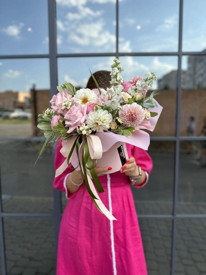Квіткова коробка з трояндами та матрікарією – це справжній витвір флористичного мистецтва. Жоржина, півонії, троянда, дельфініум, евкаліпт, еустома та матрікарія створюють неповторну композицію, яка наповнить ваш дім ароматом свіжості та краси. Замовивши цю коробку, ви подаруєте собі або близьким незабутні миті радості та натхнення. Не втрачайте можливість зробити день особливим – замовляйте квіткову коробку з трояндами та матрікарією вже сьогодні!