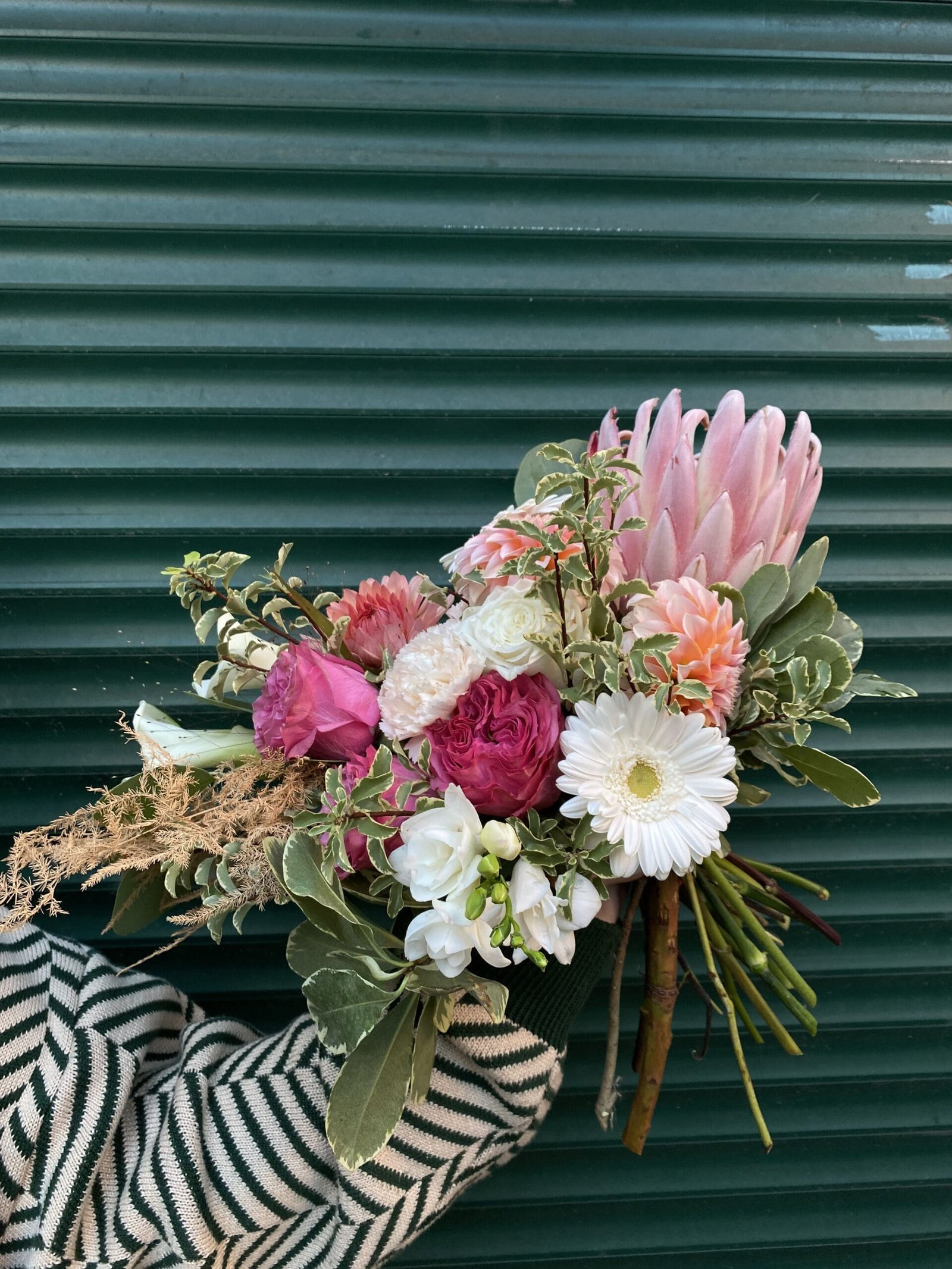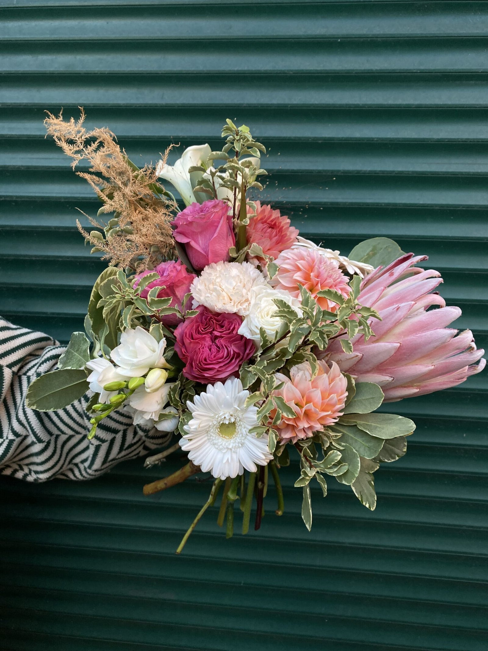 Замовляйте та занурюйтесь в мрійливу атмосферу кохання та відчуйте магію моменту з нашим весільним букетом з жоржинами та протеєю. Він витканий з найніжніших квітів, серед яких діантус, троянди та гербери, щоб символізувати вашу ніжність і пристрасть. Зантедескія та протея додають йому неповторної елегантності та унікальності. Кожна квітка, як палітра чарівних емоцій, сповільнить час і відкриває серце до безмежного щастя та радості весільного дня!